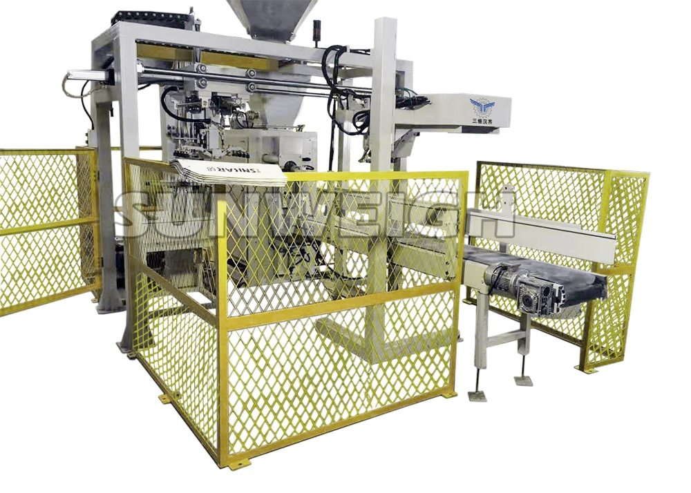 全自動閥口袋包裝機由自動袋庫、上袋機械手、封口裝置等部分組成,可自動完成閥口袋自動上袋、自動定量灌裝、自動移袋輸送、自動封口。整個運行過程只需人工將成摞包裝袋放置自動袋庫上,當檢測到袋庫內(nèi)包裝袋即將用完時,自動報警提醒現(xiàn)場工作人員補充包裝袋。