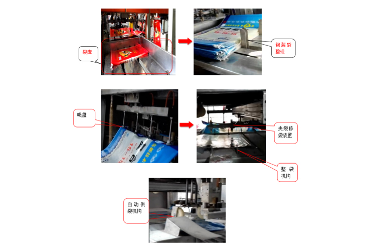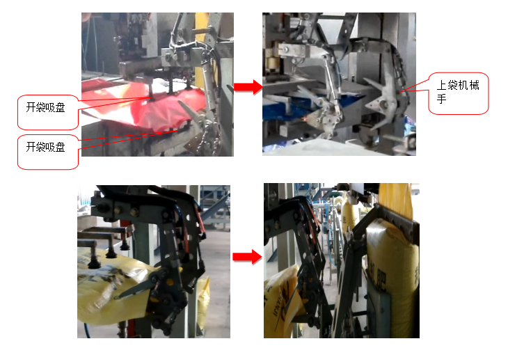 自動上袋系統(tǒng)主要包括開袋裝置和機(jī)械手上袋裝置,運(yùn)行過程如圖: