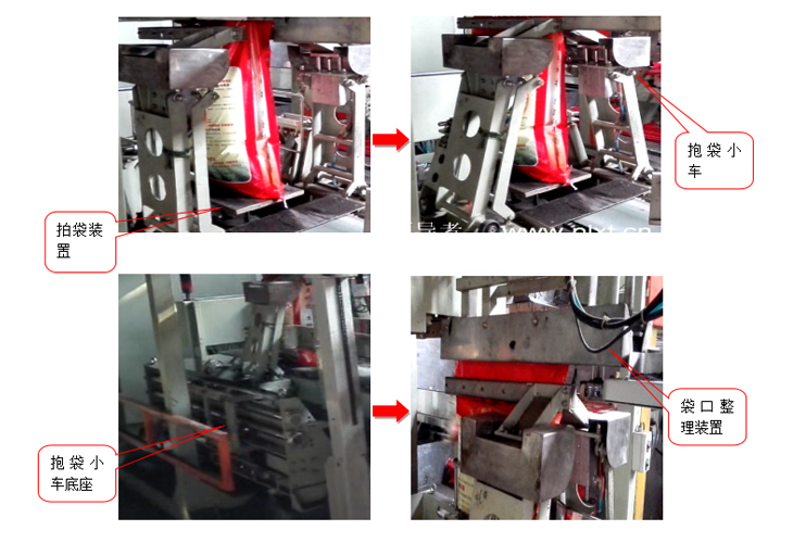 定量包裝機(jī)下料灌裝的過程中,底部的拍袋裝置啟動,確保袋內(nèi)物料充填緊密。灌裝結(jié)束后拍打停止,下料口夾袋裝置打開,充填物料后的包裝袋在下料口放下的同時,由送包小車經(jīng)專門加工的用于粉體、顆粒物料料袋的抱包、夾包裝置將料袋中部抱住,袋口夾住,送至活動導(dǎo)入裝置,活動導(dǎo)入與熱合縫包一體機(jī)系統(tǒng)相連.經(jīng)其進(jìn)入封口傳動鏈中,保證袋口成一字形。在導(dǎo)入器附近增加吸塵口,通過與除塵系統(tǒng)連接可吸走夾住袋口時飛出的粉塵.